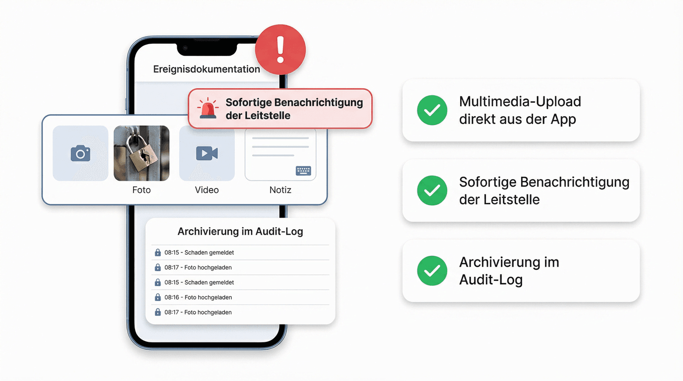 Fotos, Videos und Notizen zu Vorkommnissen werden in Sekunden erfasst – inklusive automatischer Eskalationsketten und Push-Alarmen.