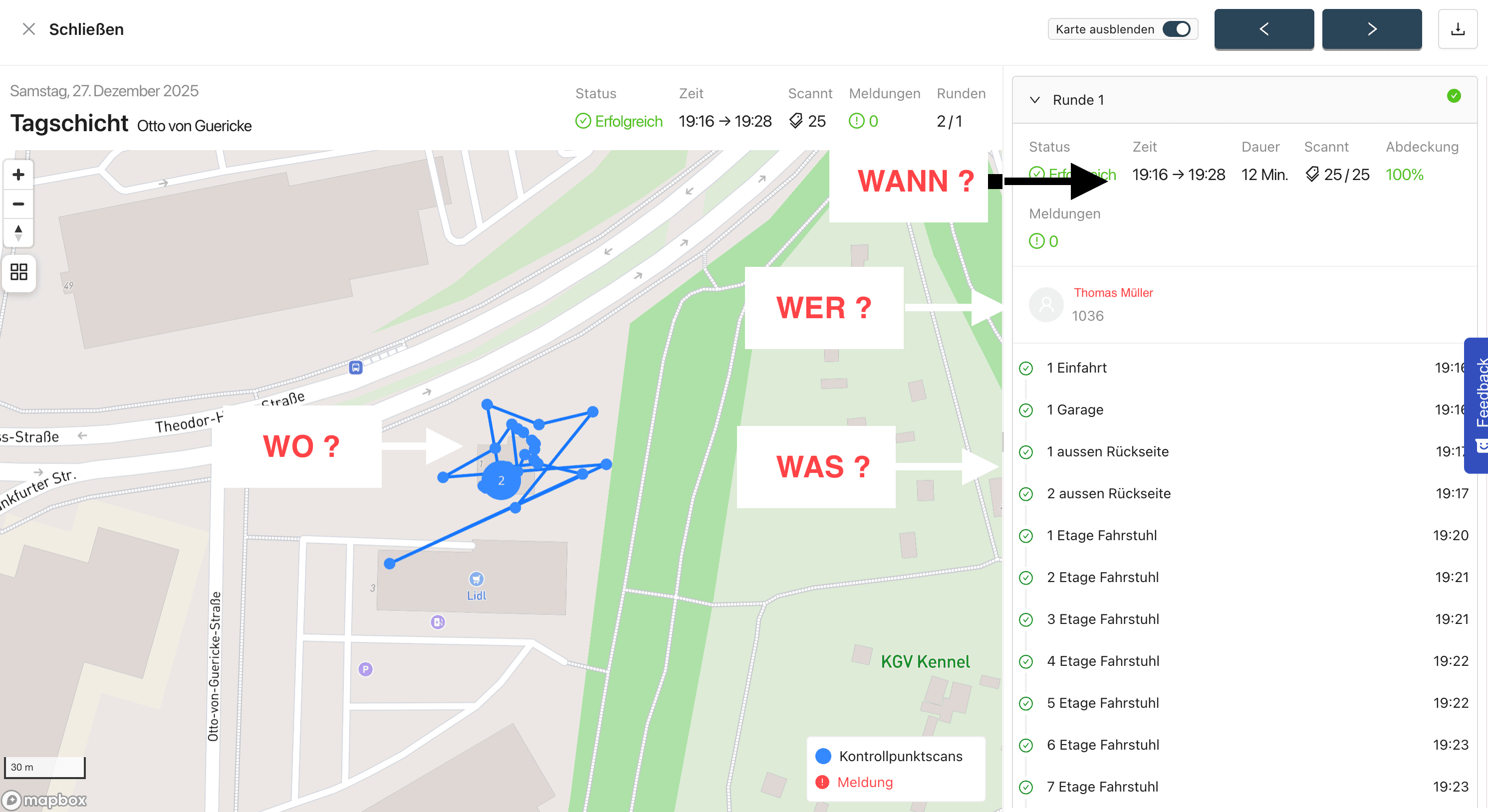 Im Revierdienst werden mehrere Objekte mobil angefahren. Das Wächterkontrollsystem dokumentiert jeden Kontrollpunkt mit Zeit und Standort und stellt die Scans übersichtlich in einer Kartenansicht dar.