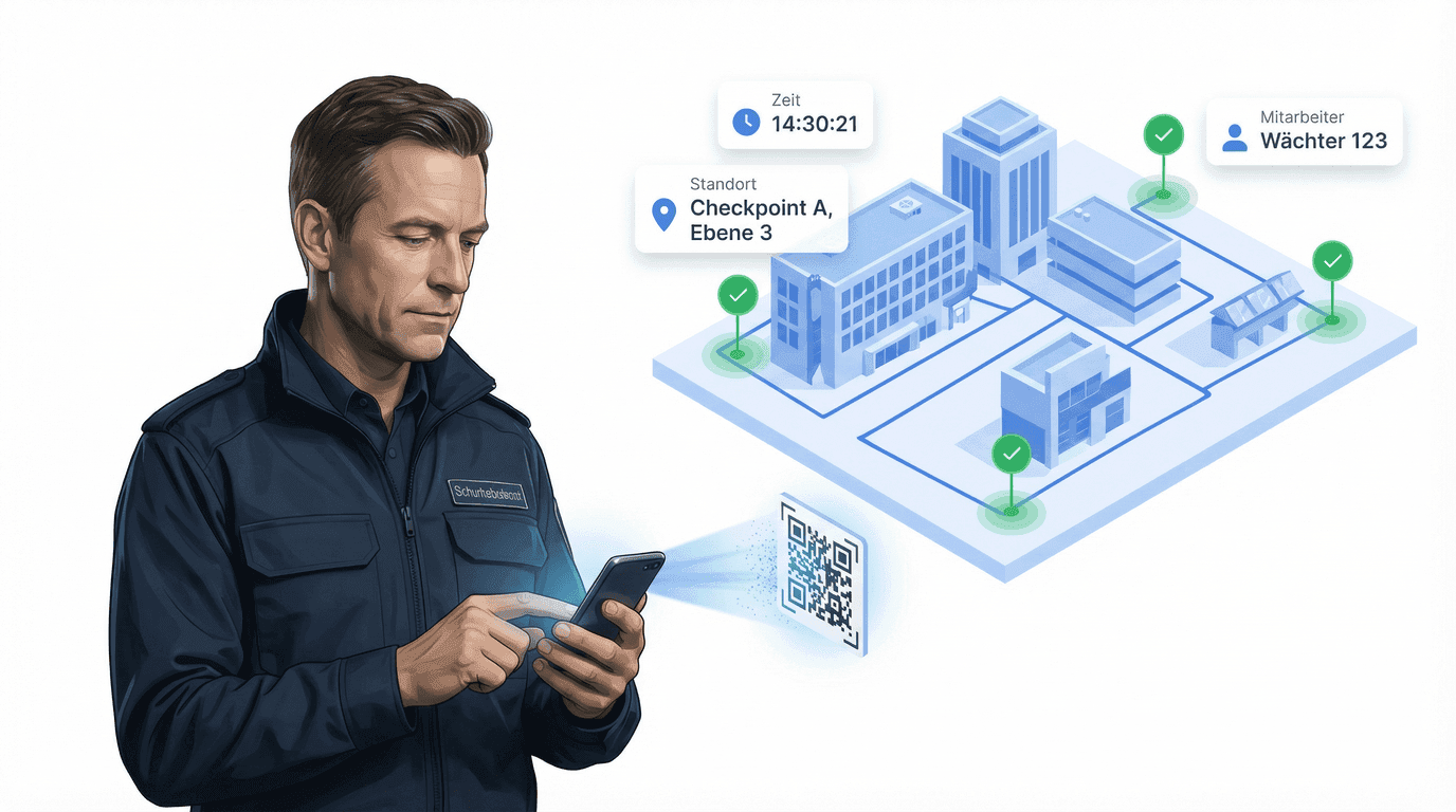 Bei einem Wächterkontrollsystem werden Kontrollpunkte entlang eines Rundgangs festgelegt. Diese Punkte werden während des Rundgangs per Smartphone oder Gerät gescannt. Das System dokumentiert den Ablauf automatisch.